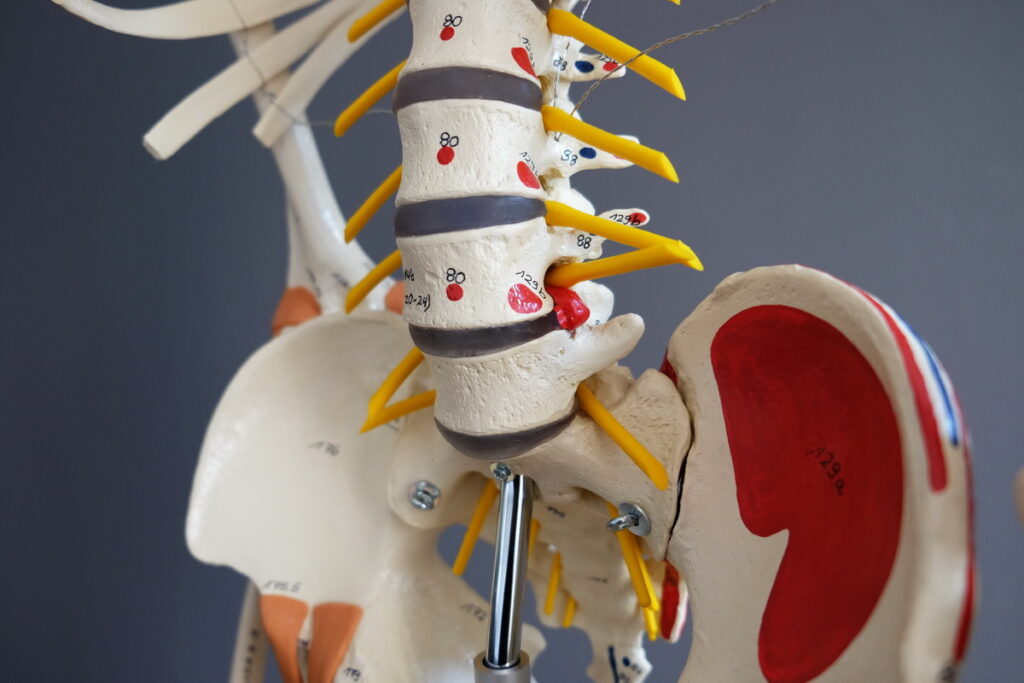 Ein Bandscheibenvorfall zwischen Lendenwirbel 4 und 5, der nach hinten und seitlich auf den austretenden Nerv drückt und somit grosse Beschwerden hervorrufen würde.