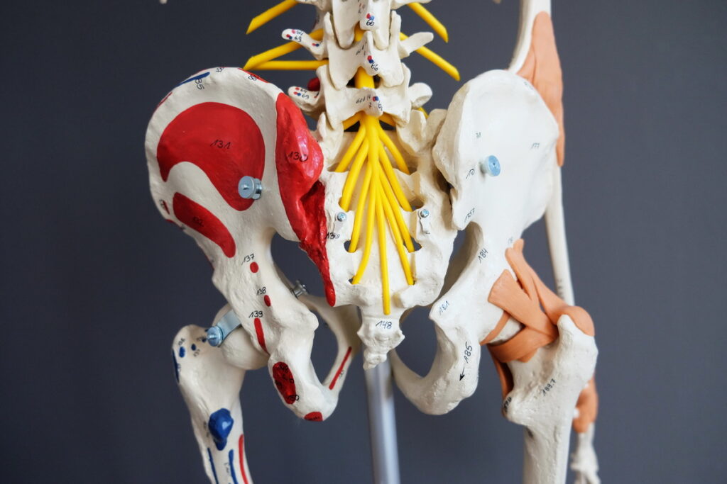 Becken und Hüftgelenke von hinten, das Kreuzbein (Os sacrum) ist eröffnet, damit die Nerven darin sichtbar sind das ISG (Iliosakralgelenk) ist zwischen Kreuzbein und Beckenschaufel (Os Ilium).