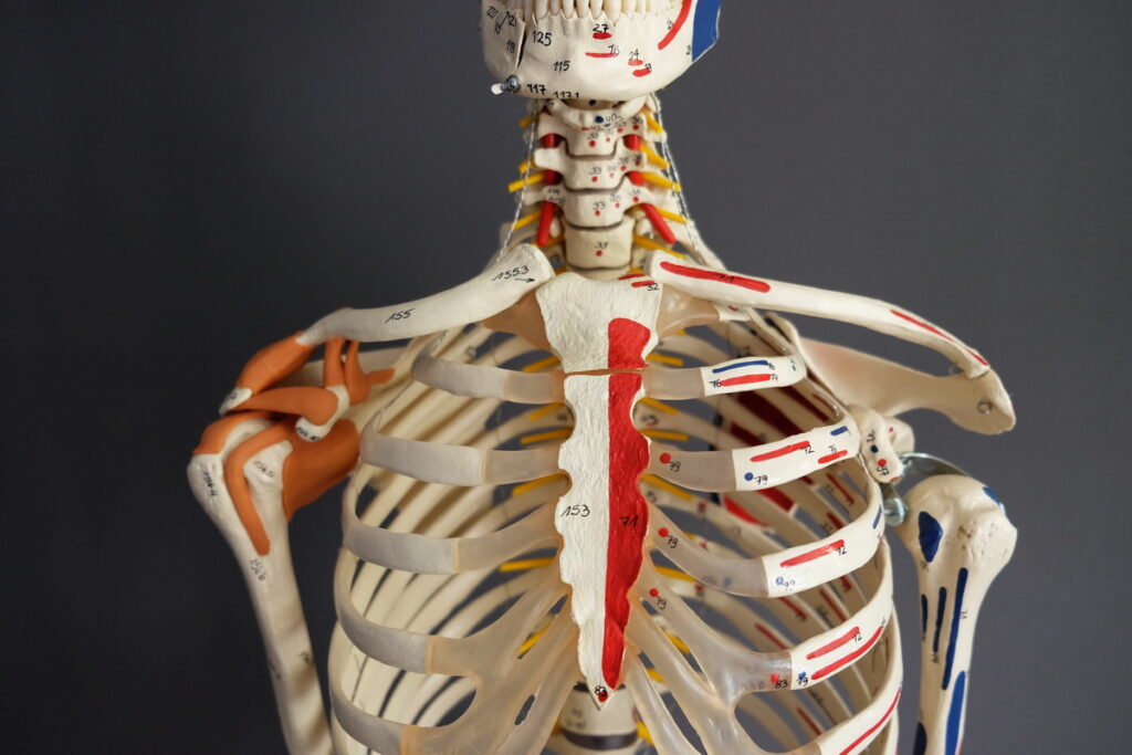 Brustkorb von vorn, Muskelursprünge rot, Muskelansätze blau. Die linke Schulter (im Bild rechts) ist luxiert (ausgekugelt).