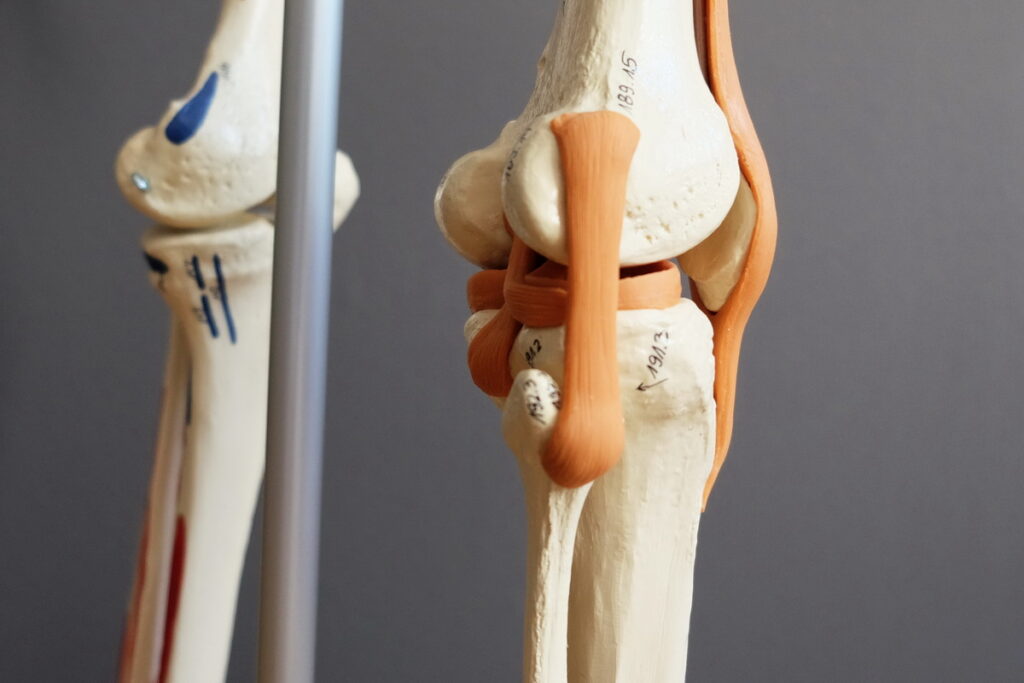 rechtes Kniegelenk mit Aussenband, Kniescheibe, Menisken und Kreuzbändern.